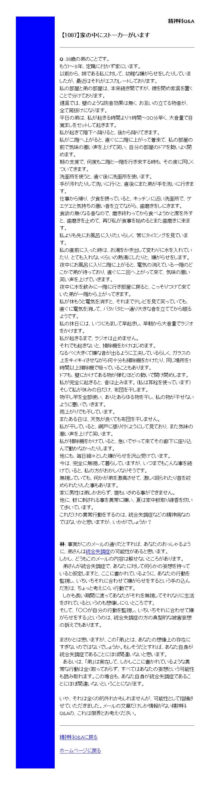 【1087】家の中にストーカーがいます Dr林のこころと脳の相談室