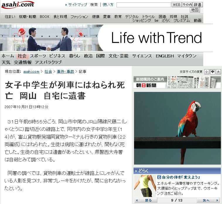 31日午前6時55分ごろ、岡山市中尾のJR山陽線尺藤二(しゃくとうに)踏切近くの線路上で、同市内の女子中学3年生(14)が、富山貨物駅発福岡貨物ターミナル行きの貨物列車(22両編成)にはねられた。生徒は病院に運ばれたが、間もなく死亡した。生徒の自宅には遺書があったといい、県警西大寺署は自殺とみて調べている。