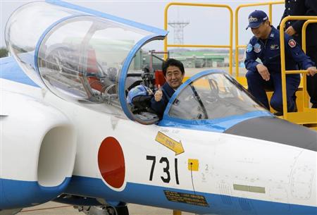 画像:航空自衛隊松島基地を激励に訪れ、ブルーインパルスに乗り込んで親指を立てる安倍首相=12日午後、宮城県東松島市(松本健吾撮影)