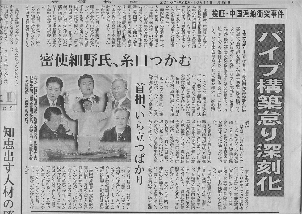 また、船長釈放後に民主党の細野豪志氏が訪中し、中国外交を統括していた戴秉国国務委員と会談したことに関し、 仙谷氏は訪中が自身の指示だったことを認めた。インタビューは今月19日に東京都内で行われた。
