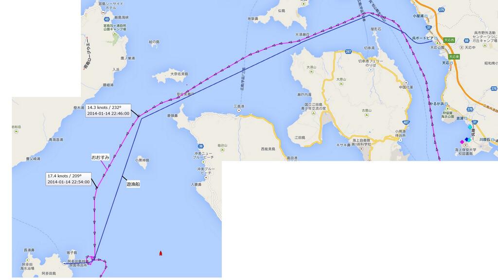 これが遊漁船の航跡なら衝突地点でGPSは途切れてるはずだよね