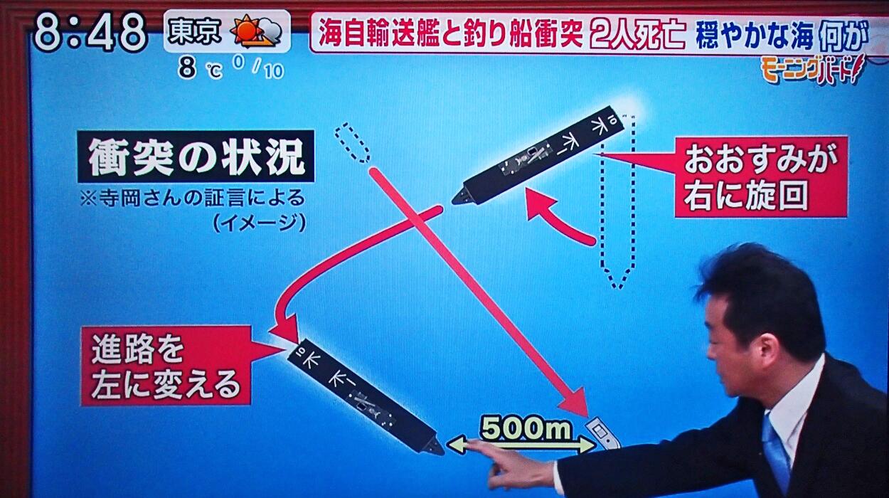 メディアはいきなり専門家らしき人からのコメントを取ろうとするが、せめて小型船舶免許をアナかレポーターに取得させて最低限の知識を持つ人をおくべき。自衛艦側の大きさの船の速力に応じた旋回力、停船までの距離とプレジャーボートの停船までの秒数を調べれば事故回避は一番簡単かがすぐにわかる。事故を避けるのが一番重要。FRPの軽い船はスロットルオフで構えてないと転びそうになる程の減速するだろう。