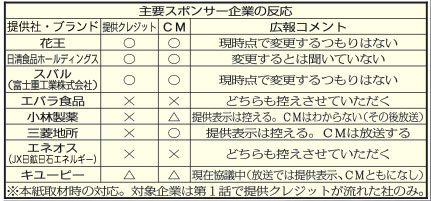 エバラ食品工業、キユーピー、JX日鉱日石エネルギーの3社はCMも流れず、代わりにACジャパンのCMが流れた。