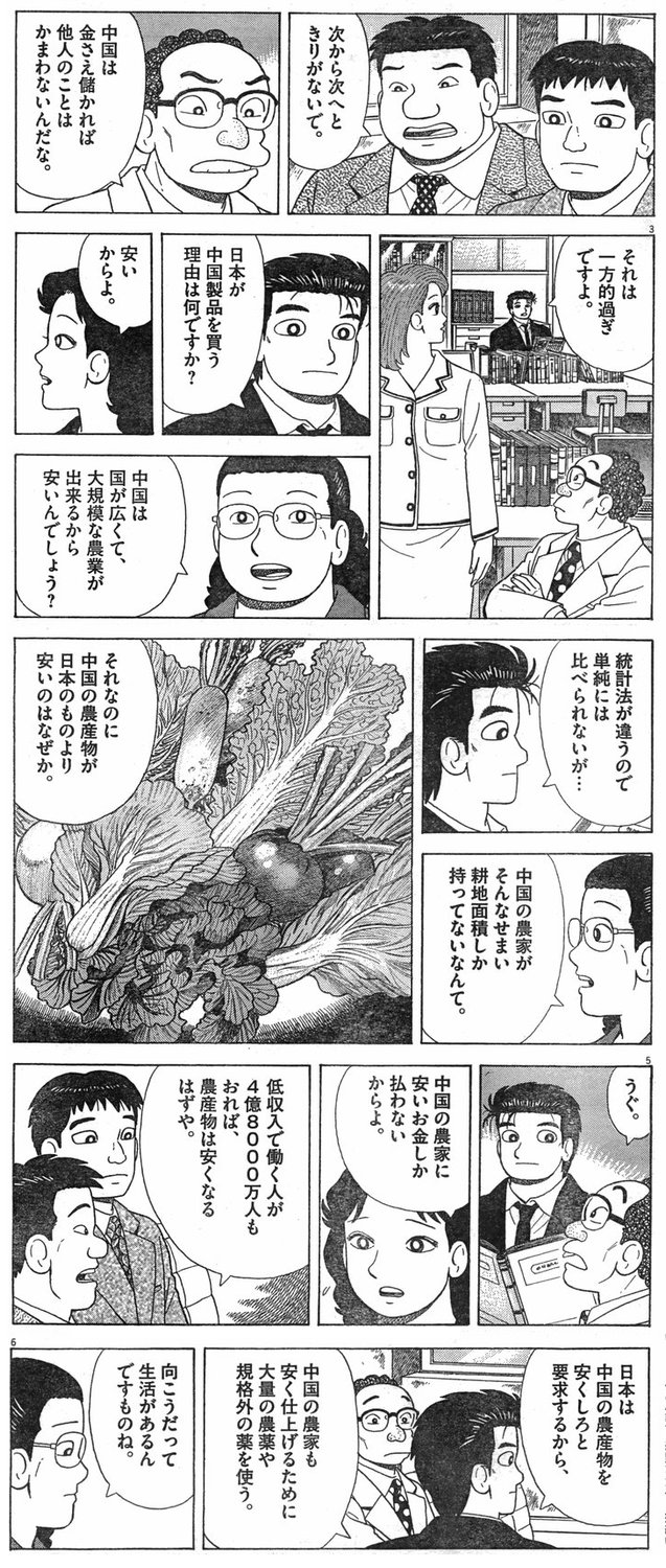 悪意を個人的に感じたのは、漫画一枚目6コマの日の丸とセリフ、最終9コマの瑞々しく描かれた野菜とセリフが安価な中国野菜。福島の農産物以前に中国野菜の農薬問題まで持ち出すてんこ盛り。絵は一瞬で頭に入りますからねぇ、頭の中もてんこ盛りで一緒くたになる。