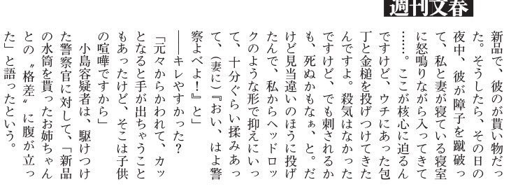 そうそう、それが下の階に住んでいる人で、事件のあった朝、ちょっと揉めていたみたいだよ」(別の近隣住民)