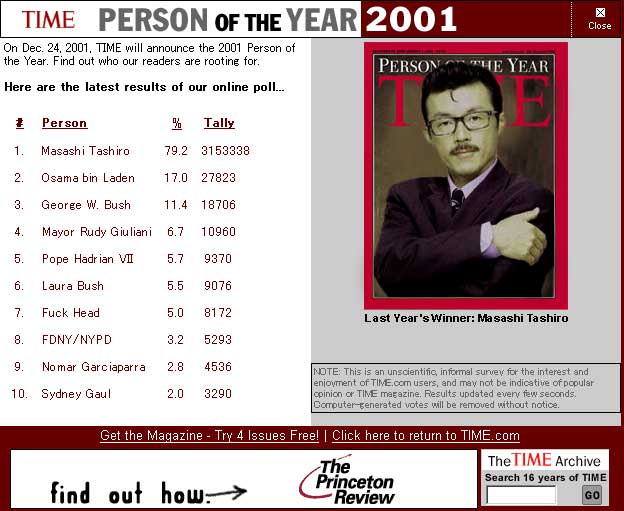 この話で思い出すのは、米タイム誌の「世界で最も影響力のある100人」だ。 これには随分前から読者がネットで投票できるシステムがあったのだが、 なぜか06年から、世界的に知られているとは言い難い韓国人アーティストが何年も続けてトップになるという現象が起きて話題になっていた。 おそらくファンが、ネットを使ってどんどん投票を行ったのだろうとの声もあった。